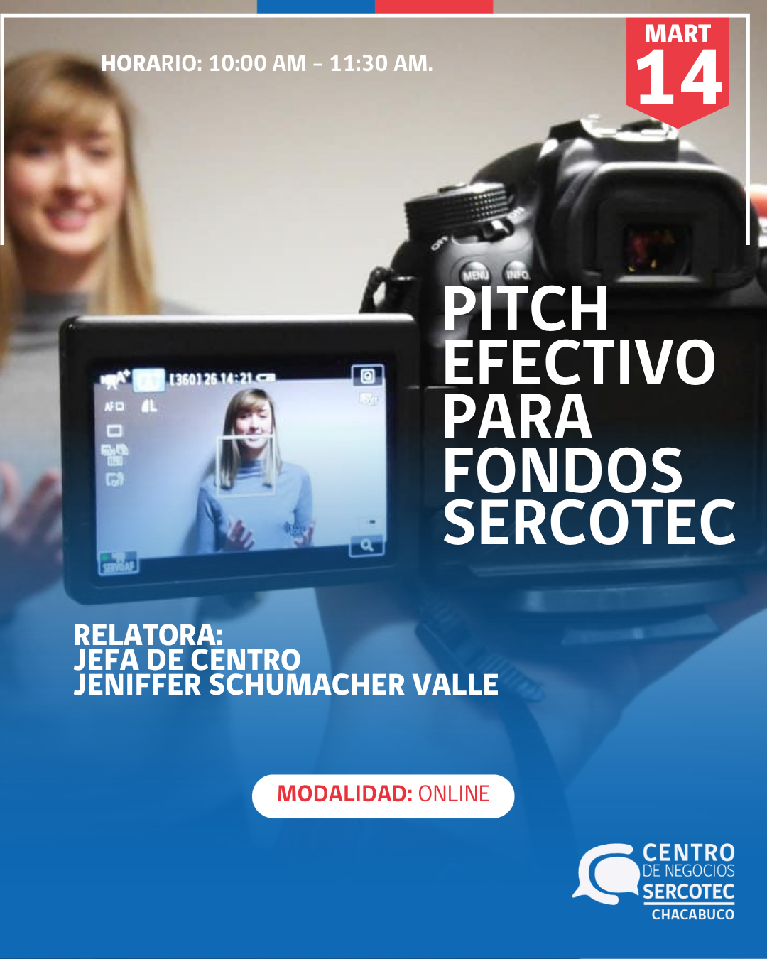 Aprende a estructurar y presentar un video pitch efectivo en solo una hora. Descubrirás técnicas claves para captar la atención, transmitir tu mensaje con claridad y destacar tu propuesta en formato audiovisual. Ideal para emprendedores que quieren postular a fondos concursables de SERCOTEC. |
