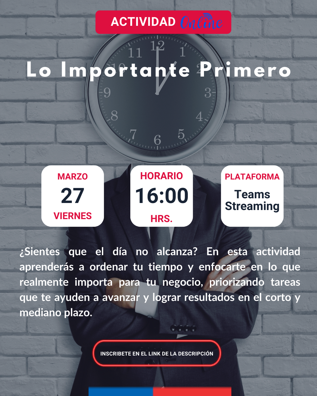 ¿Sientes que el día no alcanza? En esta actividad aprenderás a ordenar tu tiempo y enfocarte en lo que realmente importa para tu negocio, priorizando tareas que te ayuden a avanzar y lograr resultados en el corto y mediano plazo.